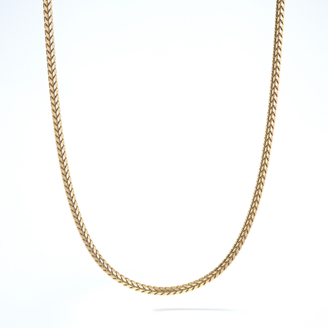 Meticulously crafted from solid 14 karat yellow gold in the USA, the 1.5mm Diamond Cut Franco Chain draws inspiration from the iconic Cuban Link Chain, featuring an intricate V-shaped pattern with two sets of interlocking links.