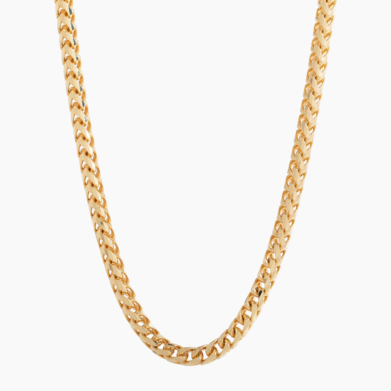 Meticulously crafted from solid 14 karat yellow gold in the USA, the 3.5mm Diamond Cut Franco Chain draws inspiration from the iconic Cuban Link Chain, featuring an intricate V-shaped pattern with two sets of interlocking links.
