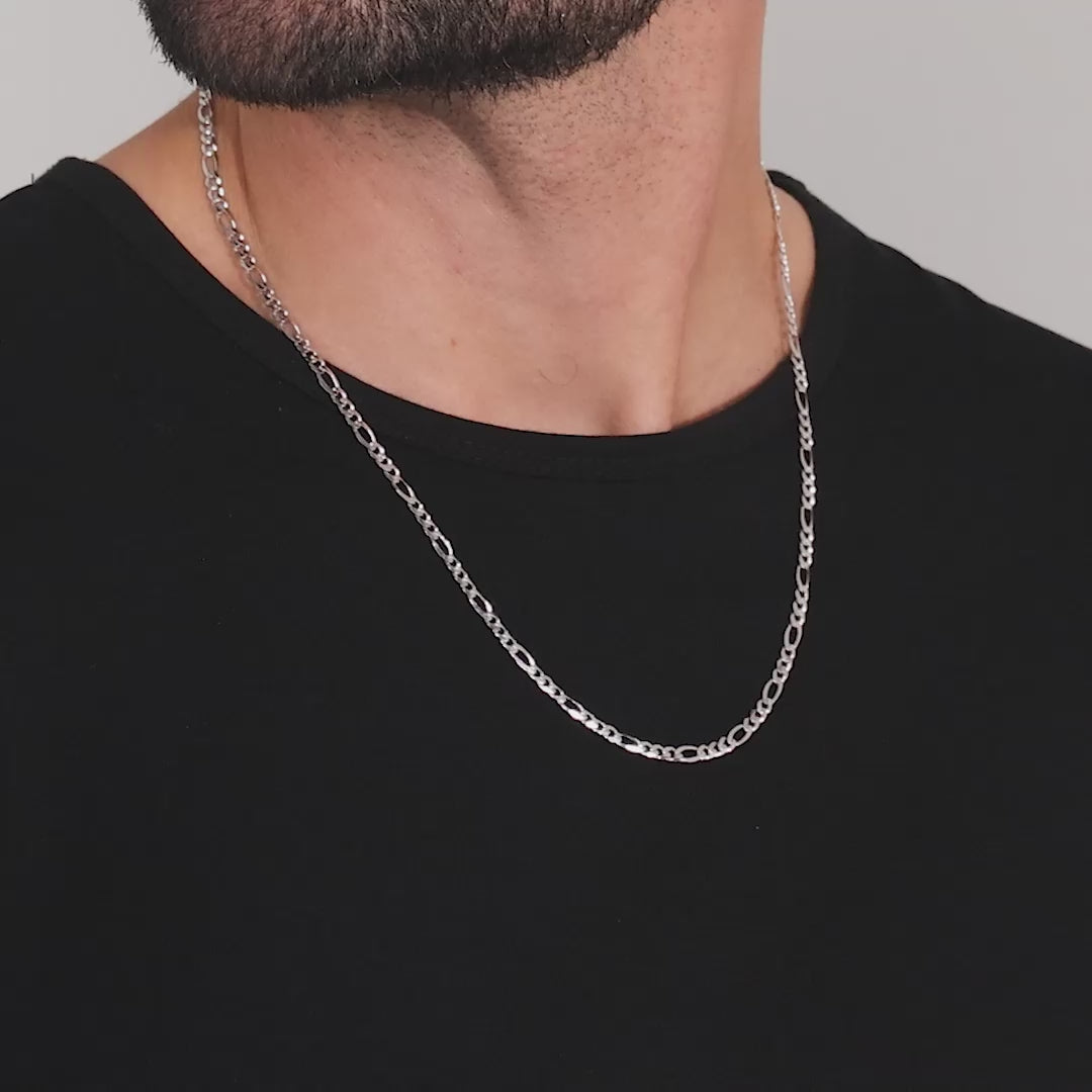This 4mm silver Figaro chain is crafted in solid sterling silver and finished with a rhodium plating for maximum protection and shine. The luxurious silver chain for men is stamped with the .925 quality hallmark symbol for quality guarantee.