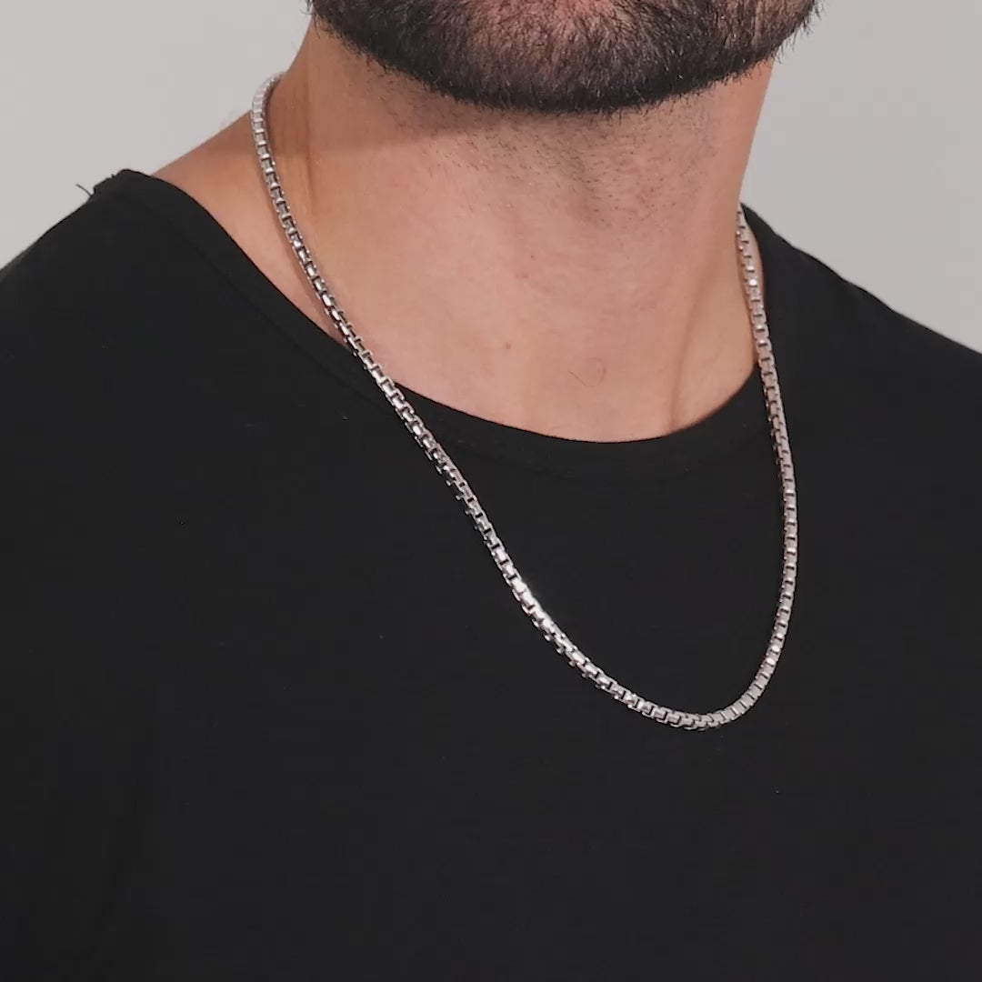 Crafted in Italy from solid sterling silver, the 4mm GEOLUX Round Box Chain redefines a classic with a sharper, more masculine edge. Its sleek round-box design delivers strength and fluid movement, while premium rhodium plating enhances its brilliance and guards against tarnish.