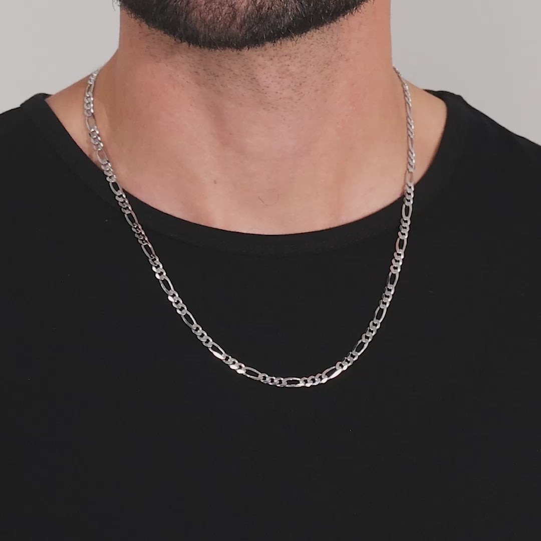 This 5mm silver Figaro chain is crafted in solid sterling silver and finished with a rhodium plating for maximum protection and shine. The luxurious silver chain for men is stamped with the .925 quality hallmark symbol for quality guarantee.