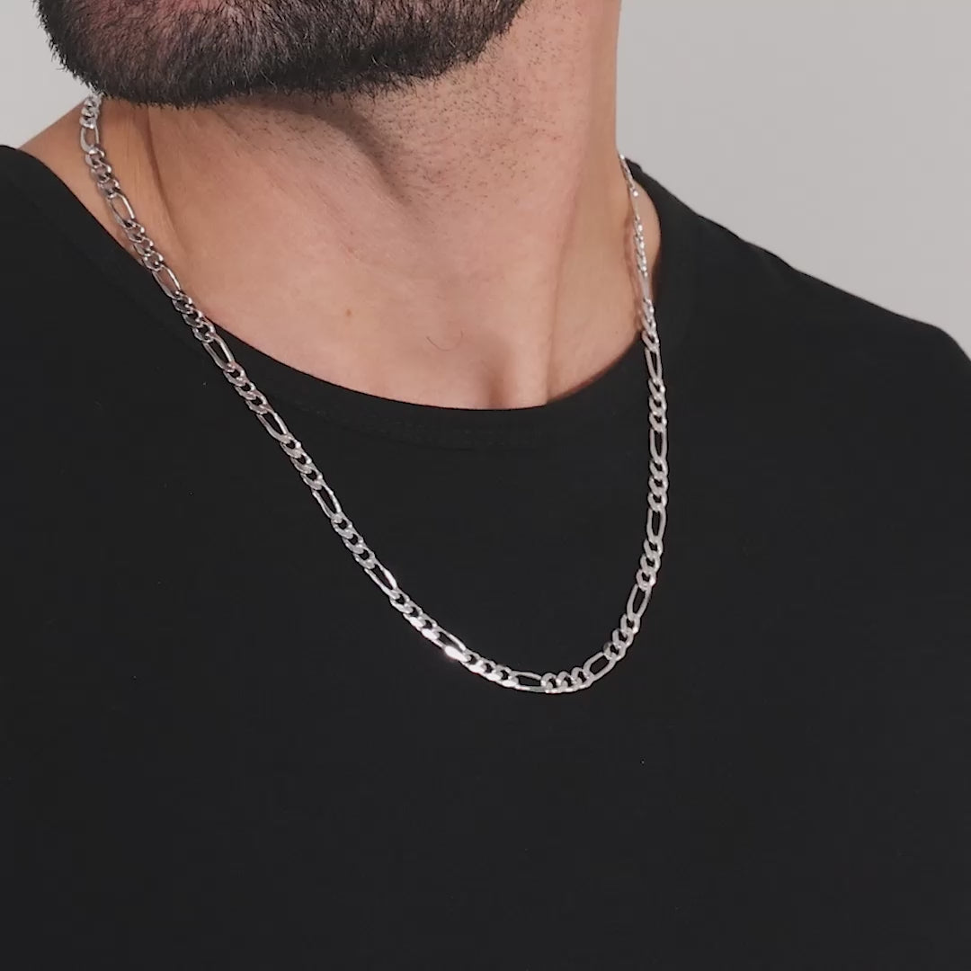 This 6mm silver Figaro chain is crafted in solid sterling silver and finished with a rhodium plating for maximum protection and shine. The luxurious silver chain for men is stamped with the .925 quality hallmark symbol for quality guarantee.
