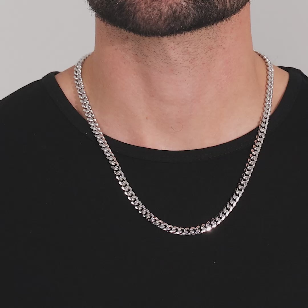 Resonate Power and Luxury with our Italian-crafted, solid Sterling Silver 7mm Miami Cuban Link Chain - finished with a protective rhodium overlay. This iconic men's silver chain is the ultimate, must-have daily wear silver necklace for men. It combines timeless elegance with modern masculinity, featuring thick, meticulously crafted links with the perfect weight and shine. It's a piece you'll wear day after day and never want to take off.