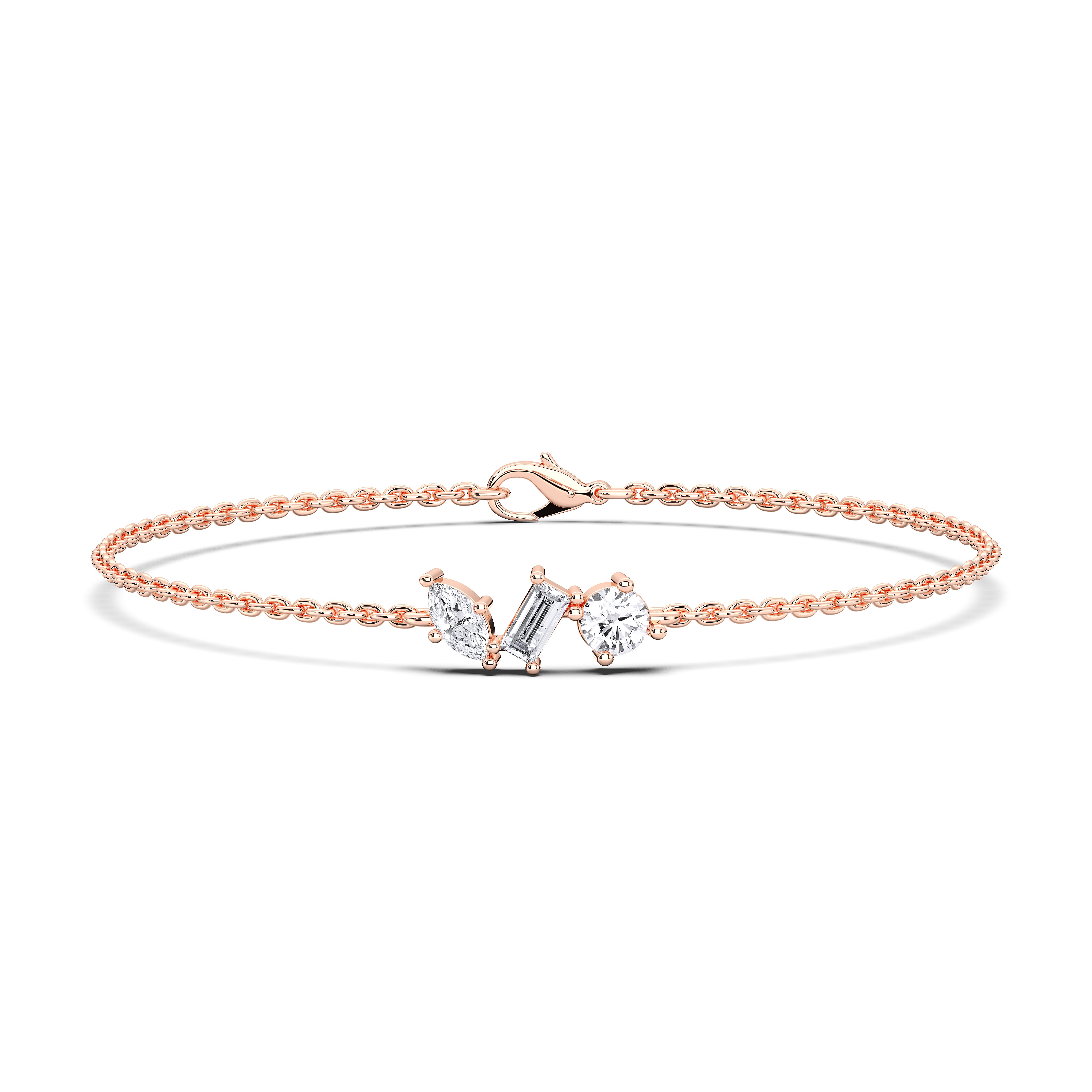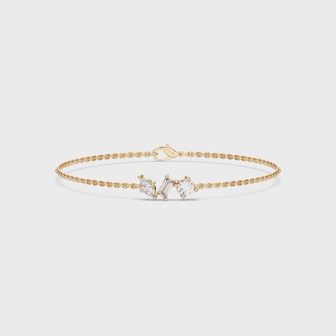 Handcrafted from solid 14k gold, the 3-Stone Multishape Bracelet is a captivating expression of artistry and elegance. Featuring a harmonious trio of lab-grown diamonds — round, emerald, and marquise cuts — this bracelet celebrates individuality through symmetry and brilliance.