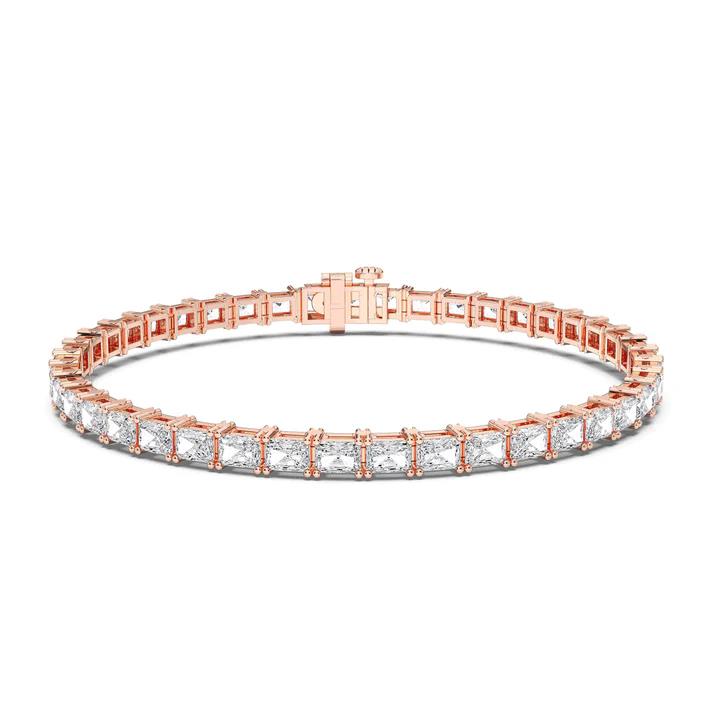 Handcrafted from solid 14k gold, the Radiant Tennis Bracelet (East–West) redefines the classic tennis silhouette with modern geometry and luminous symmetry. Each radiant-cut lab-grown diamond is meticulously aligned in an east-west orientation, creating a bold, contemporary statement while maintaining a timeless aura of refinement.
