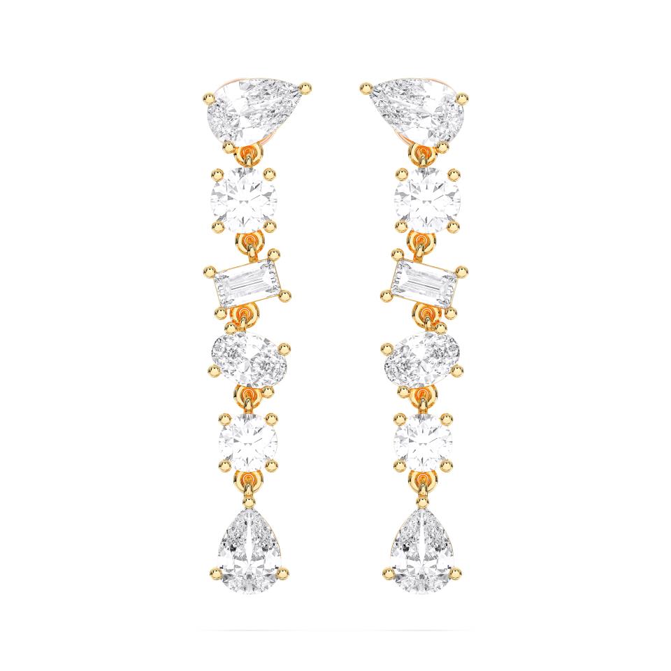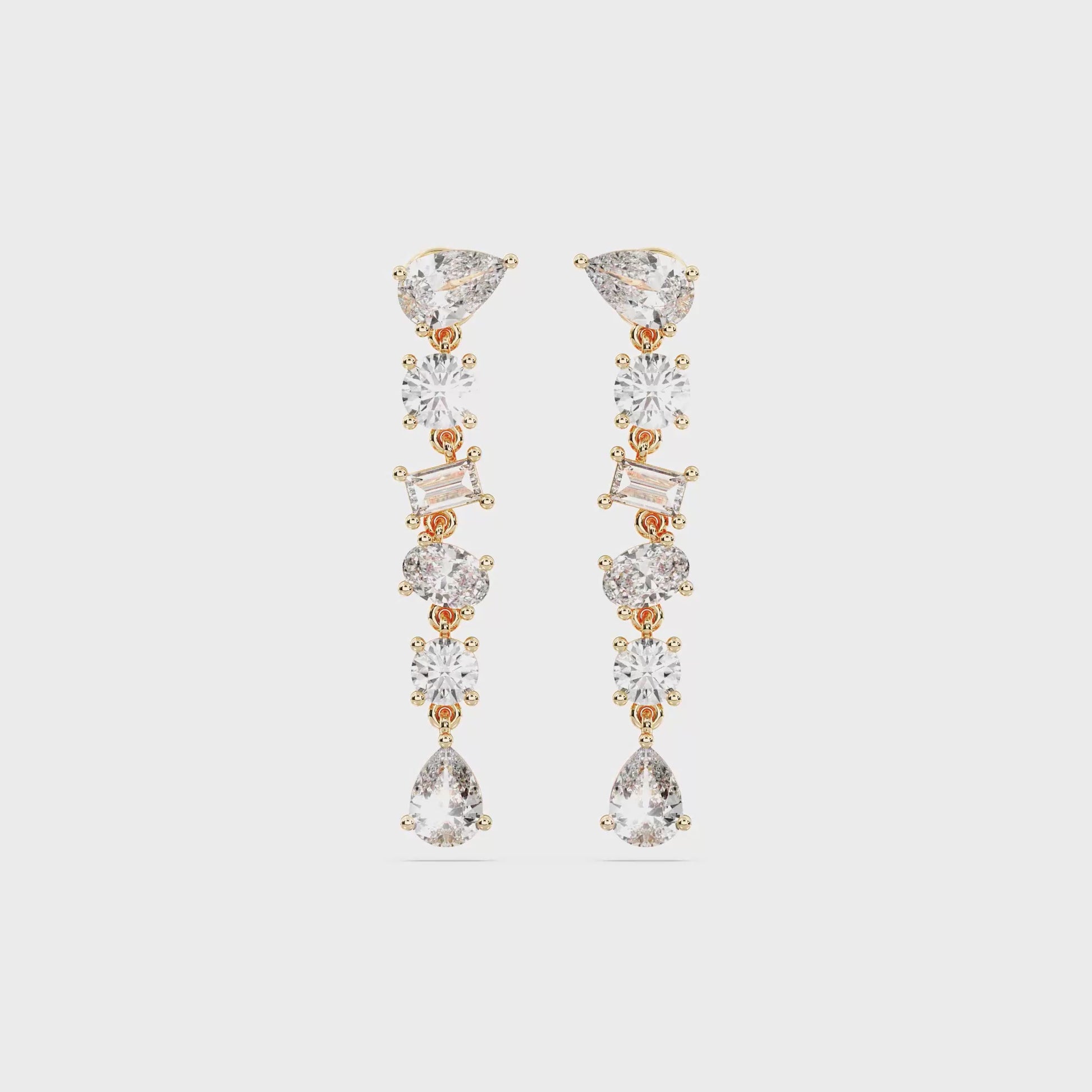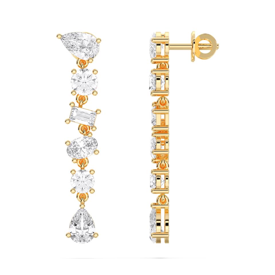 Handcrafted from solid 14k gold, the Mixed Shape Drop Earrings are a captivating symphony of geometry and light. Each earring features an elegant vertical sequence of lab-grown diamonds in varied shapes — pear, round, and baguette — creating a stunning interplay of sparkle and dimension.