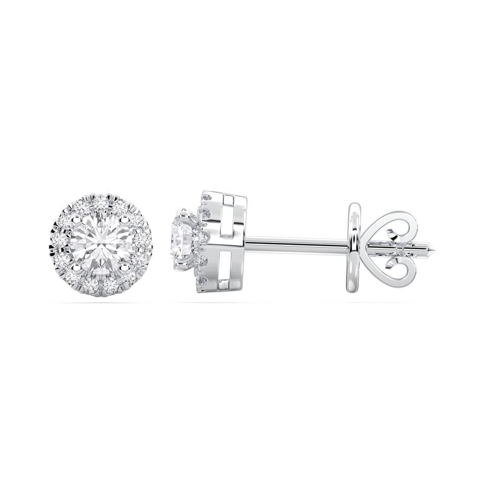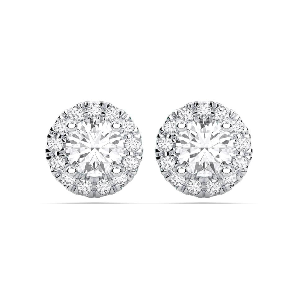 This refined halo design creates a stunning, luminous effect, maximizing the fire and brilliance of the center stone. Perfect for both everyday sophistication and evening glamour, these earrings are a versatile and essential addition to any fine jewelry collection.