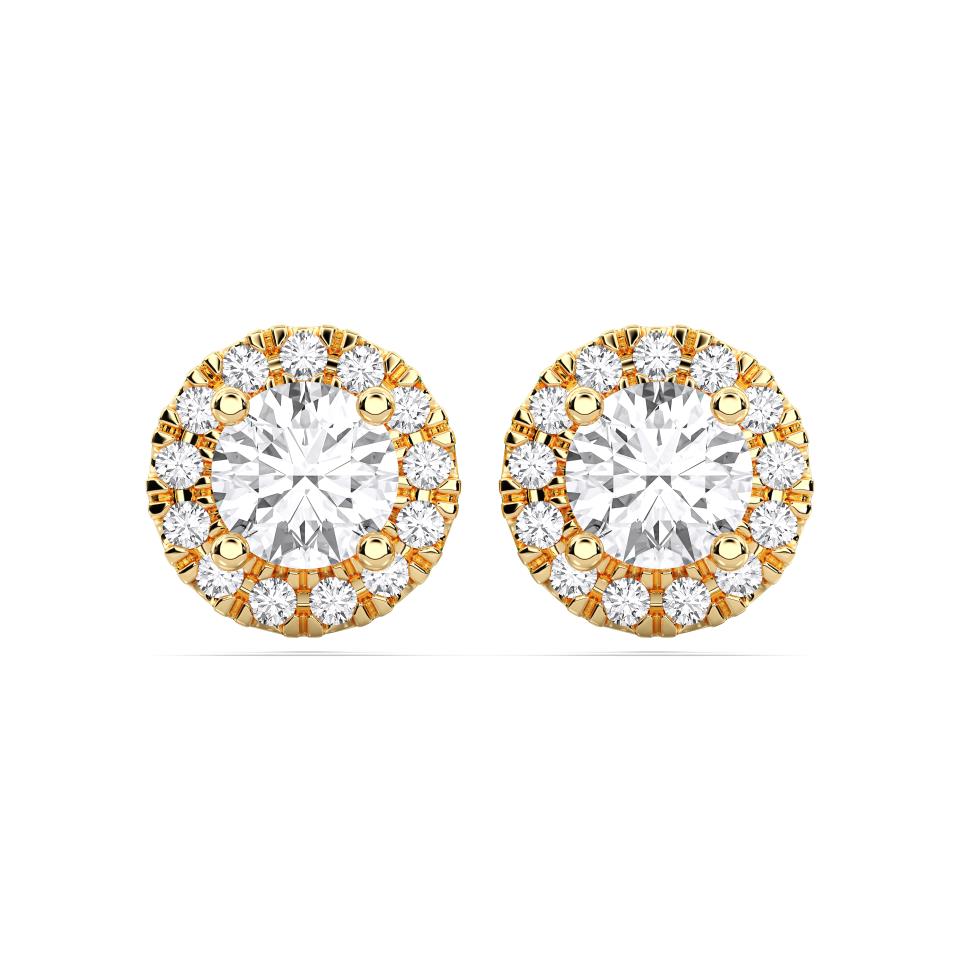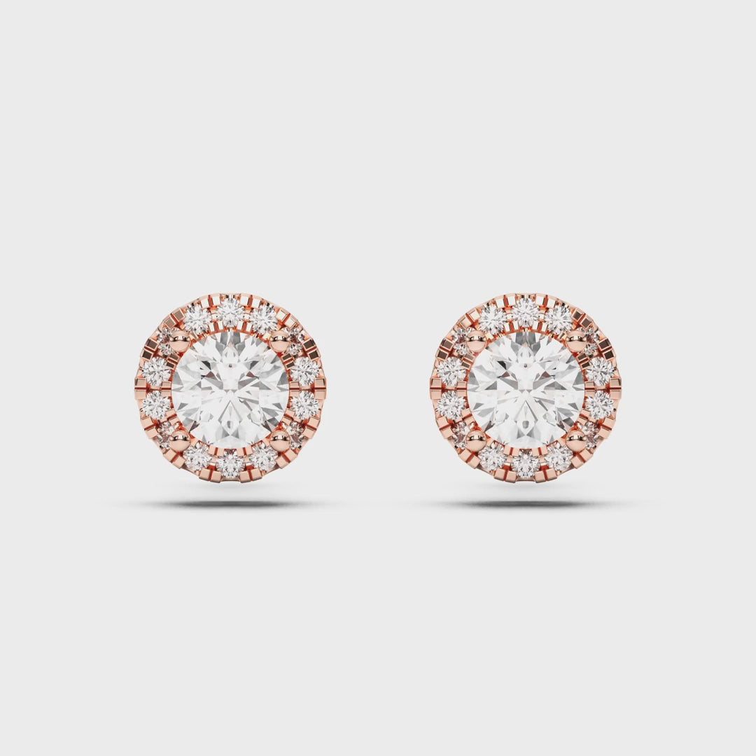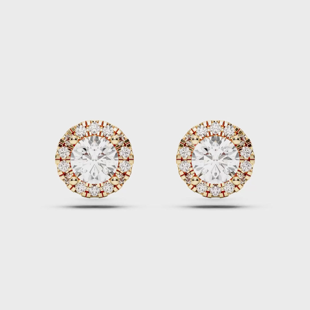 Expertly handcrafted from solid 14k gold, the Round Halo Earrings are a timeless expression of elegance and brilliance. Each earring showcases a round brilliant-cut lab-grown diamond, encircled by a delicate halo of smaller round diamonds that enhances both sparkle and size.