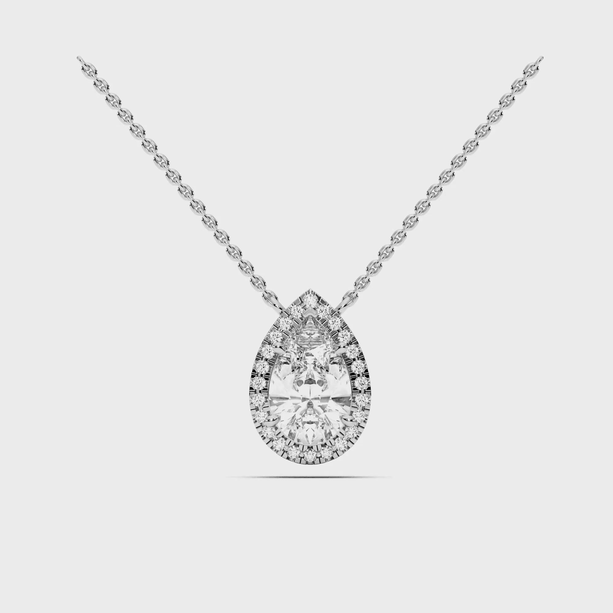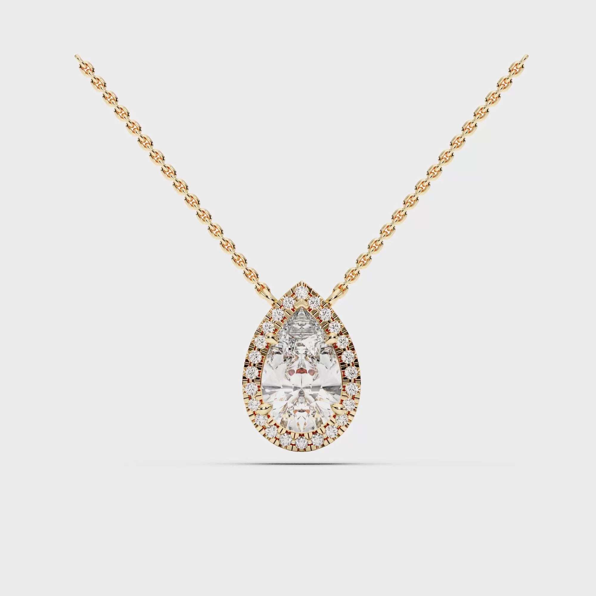 Elevate your style by pairing this pendant with our matching Pear Halo Diamond Earrings to create a cohesive and luminous look that celebrates sophistication and grace.