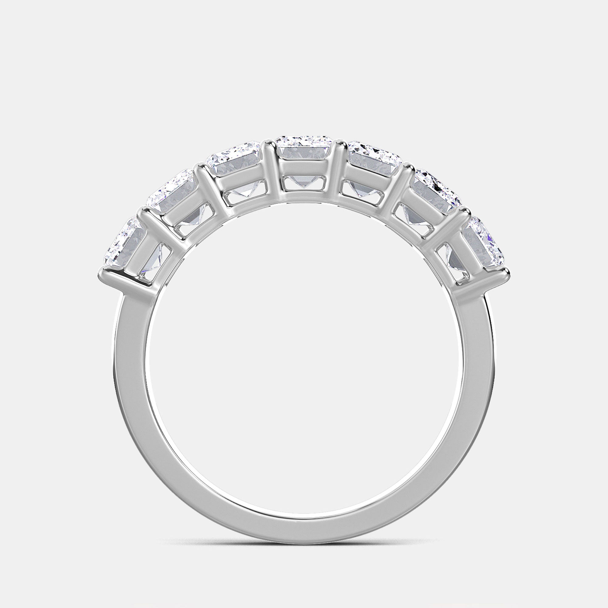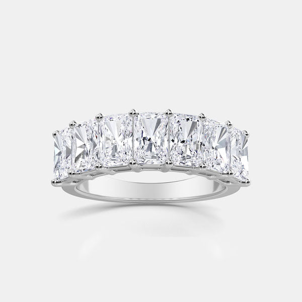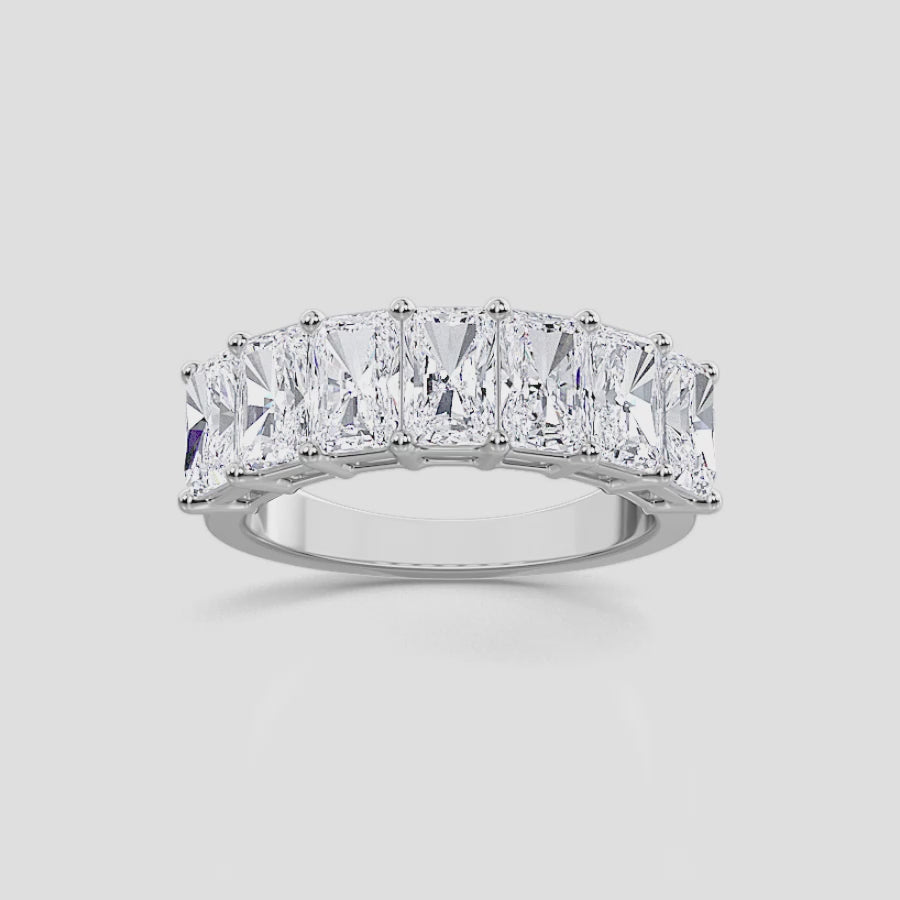 The radiant cut’s unique faceting blends the sophistication of emerald lines with the brilliance of a round, resulting in a dazzling play of light across the band. Ideal for anniversaries, milestones, or as a bold right-hand statement ring, this design celebrates luxury with modern refinement.