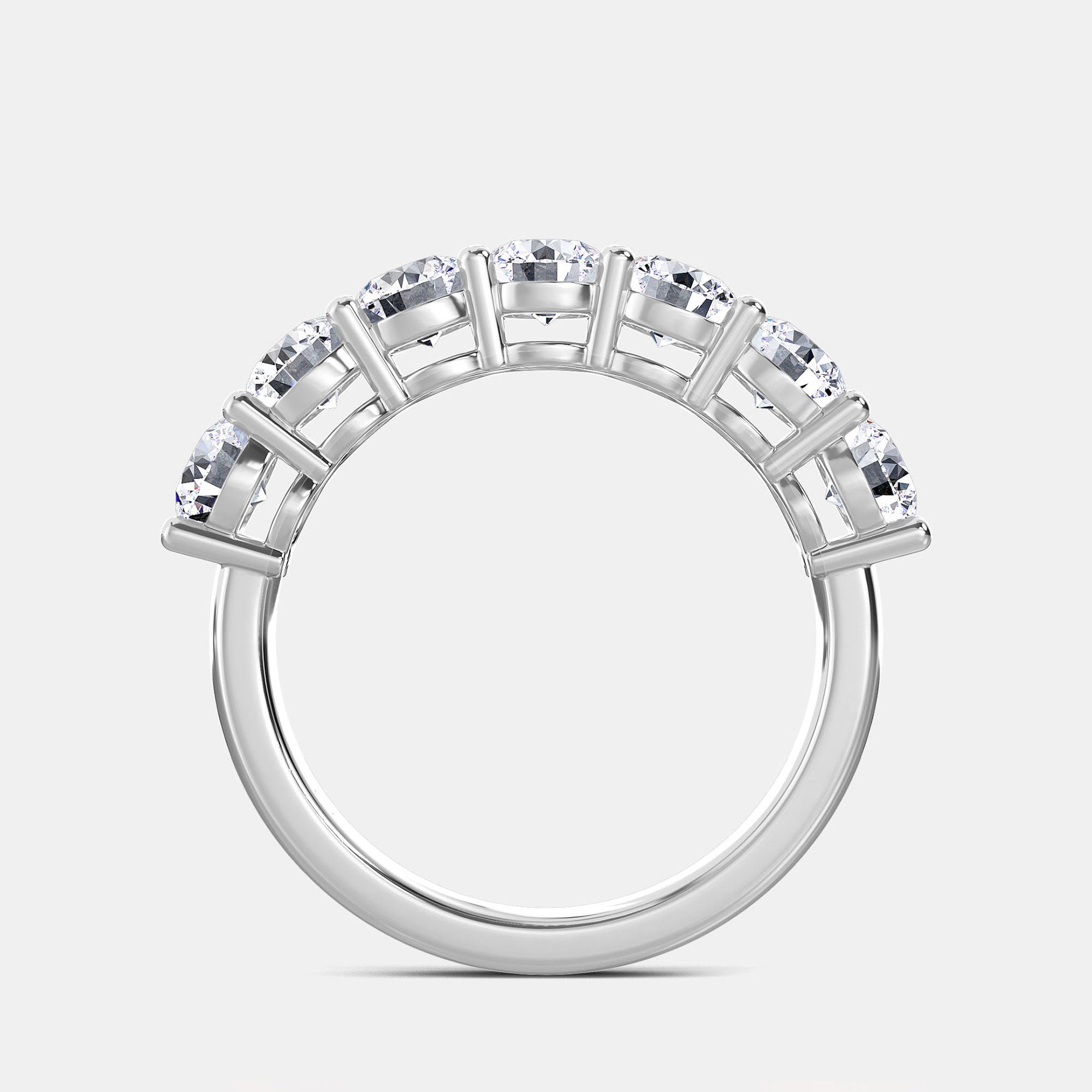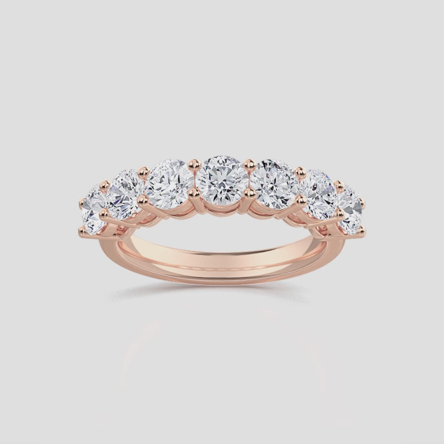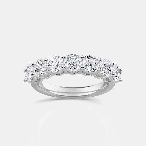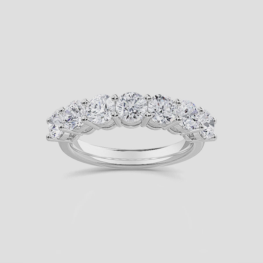 The ring’s classic seven-stone arrangement represents enduring love and balance, offering a captivating blend of symmetry and radiance. Whether worn as an anniversary band, right-hand statement ring, or paired with an engagement ring, this piece embodies both tradition and modern luxury.