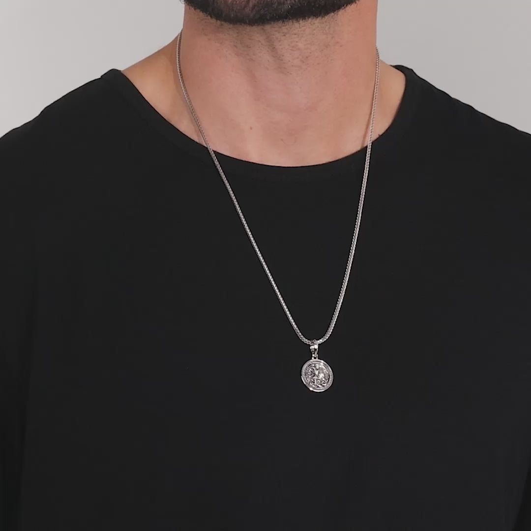 Your mens sterling silver pendant will include our world-class, luxury packaging set, including a matte black display box, protective leather pouch, and large polishing cloth.