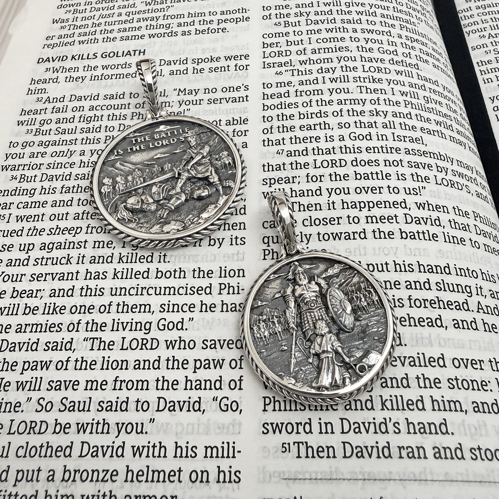 This unique men’s silver pendant is a symbol of courage, calling, and unshakable conviction. It serves as a daily reminder that faith conquers fear, purpose conquers intimidation, and no man stands alone when God goes before him.